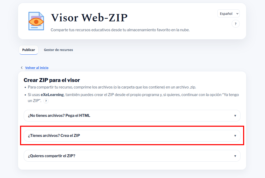 Si no tenemos los archivos que deseamos publicar y compartir elegriremos la opción Crea un ZIP.