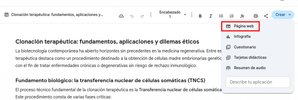 Por ejemplo, si hemos realizado un documento con Canvas de Gemini, disponemos de una opción para convertirlo en página web: