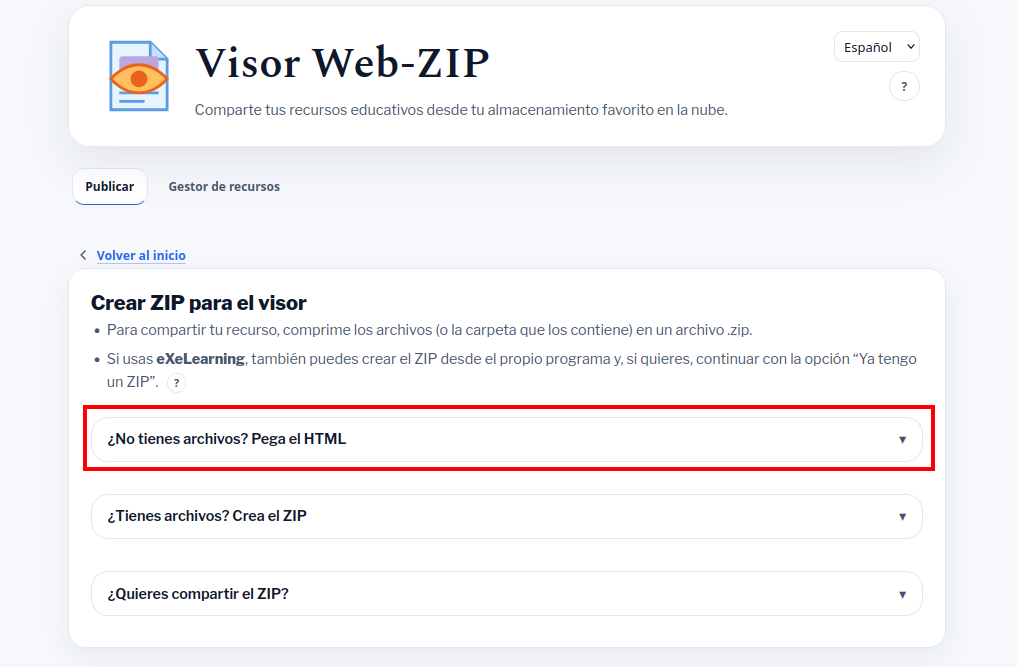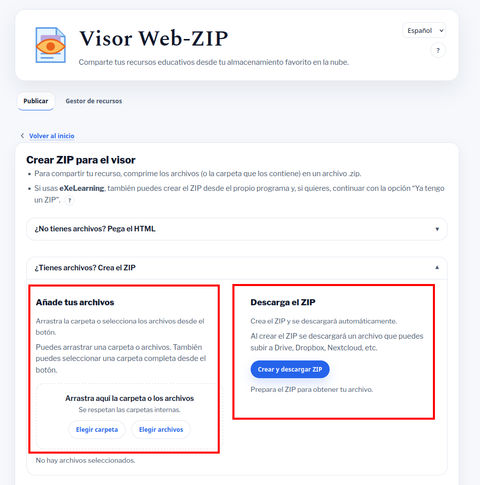Si utilizamos programas que permiten descargar los recursos educativos en formato de página web, como eXeLearning, Lumi, etc., debemos buscar la opción para descargar el recurso como archivo comprimido en ZIP o bien, descargarlo sin comprimir en una carpeta y luego comprimir la carpeta con Visor Web-ZIP.