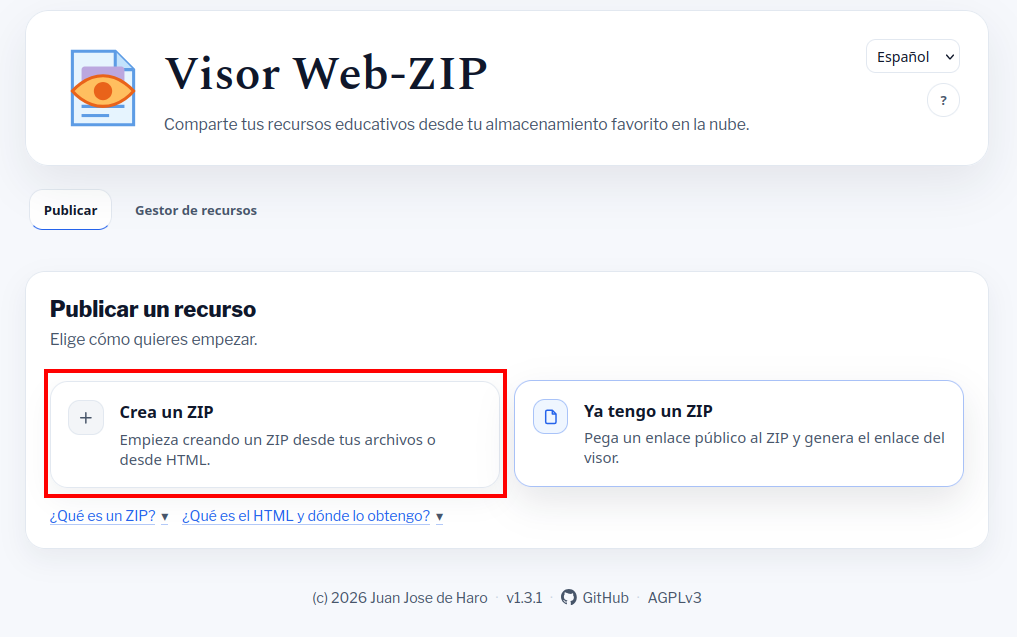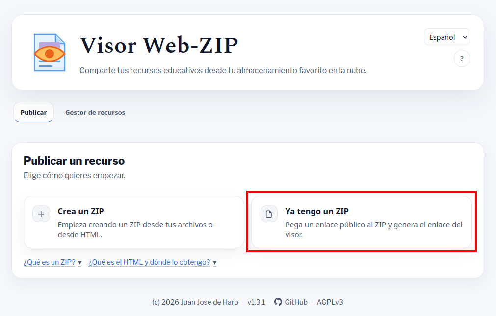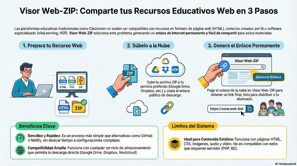 Visor Web-ZIP facilita la publicación de recursos educativos en formato HTML, creados mediante IA o software específico, superando las limitaciones de plataformas tradicionales. Esta herramienta genera enlaces permanentes visualizables desde archivos ZIP alojados en servicios nube como Google Drive. Ideal para webs estáticas, simplifica el proceso frente a servidores dedicados y cuenta con un gestor de recursos que optimiza el almacenamiento local del navegador eliminando archivos antiguos automáticamente.