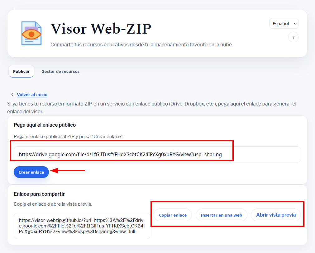 Una vez que tenemos el enlace público de nuestro archivo ZIP, volvemos al programa y en la segunda ficha: Ya tengo un ZIP, la pegamos. Obtendremos el enlace que podremos distribuir a nuestro alumnado.