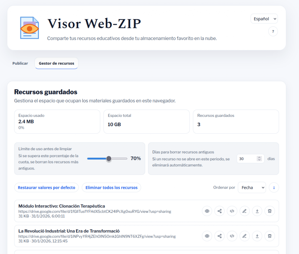 Desde aquí podemos controlar estos parámetros, así como volver a obtener los enlaces para compartir y el código para insertar en otra web. También podremos modificar el título, ver el recurso, descargar los archivos comprimidos ZIP y eliminarlos de la memoria del navegador. Los recursos se pueden ordenar en orden ascendente o descendente por título, fecha y tamaño. El botón «Restaurar valores por defecto» restaura el porcentaje y los días de borrado.