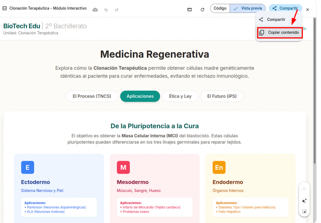 Insertar en una web: Es el código HTML de un Iframe para incrustar el recurso en otra página y que se vea como parte de ella. Incluye ajustes para una buena visualización (tamaño/altura). Pégalo en el editor HTML de tu web (Google Sites, Moodle, WordPress, eXeLearning, etc.). Si la incrustación está limitada, el visor mostrará un aviso con un botón para abrir el recurso en una pestaña nueva.