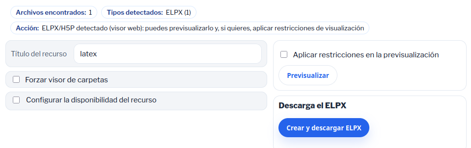 Si ya tenemos archivos ZIP, ELPX o H5p, podemos igualmente subirlos al Visor para añadirles alguna de las opciones disponibles, o sea que podemos hacer, por ejemplo, que una actividad H5p tenga fecha de caducidad o que un archivo de eXeLearning se pueda visualizar, pero no descargar. En este caso también debemos pulsar el botón Crear y descargar, y el archivo que obtendremos llevará las restricciones incorporadas.