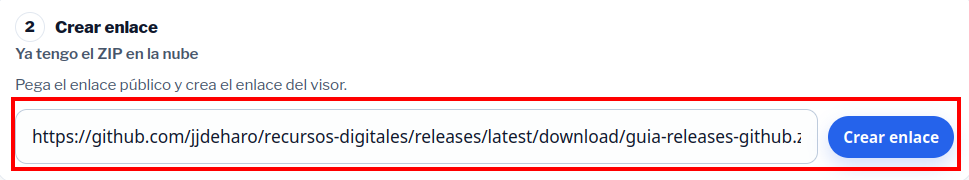 Una vez que tenemos el recurso en formato ZIP, ELPX o H5p compartido, lo pegaremos en el espacio que tiene el Visor en la parte inferior de su página principal: