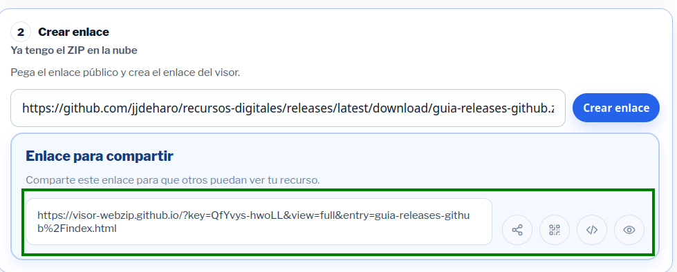 Disponemos de un botón para copiar el enlace, otro para crear un código QR, el tercero es para insertar nuestro recurso en una página web mediante un Iframe y el último para ver el recurso tal como lo verán los usuarios en su estado final.