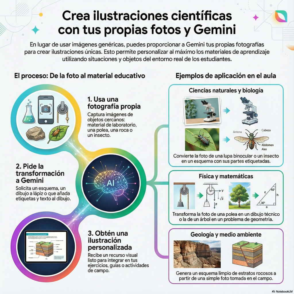• Laboratorio y ciencias naturales Una foto propia del material de disección o de un montaje sencillo puede transformarse en un esquema con etiquetas básicas.