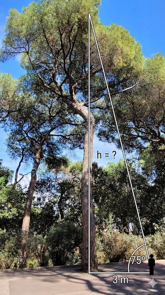 Convierte esta escena en una imagen para ilustrar el problema: Halla la altura del árbol si desde 3m de distancia de su base vemos la copa con un ángulo de 75º. ➡️