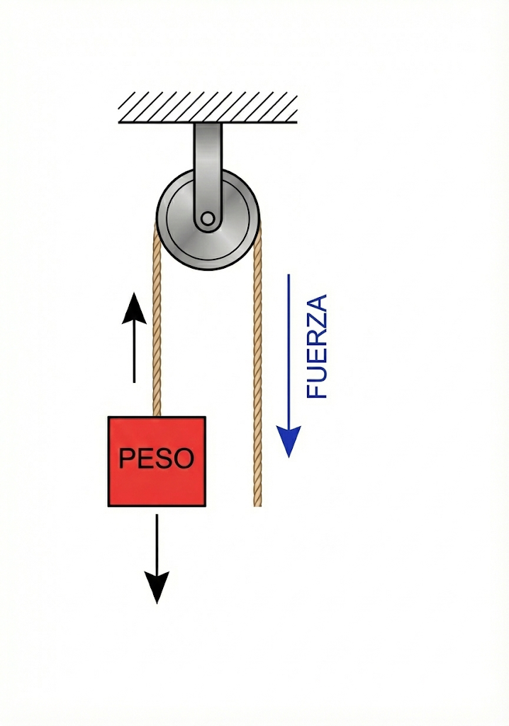 Convierte esta imagen en un esquema de líneas claras para explicar las poleas. Añade colores ➡️