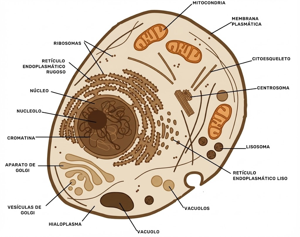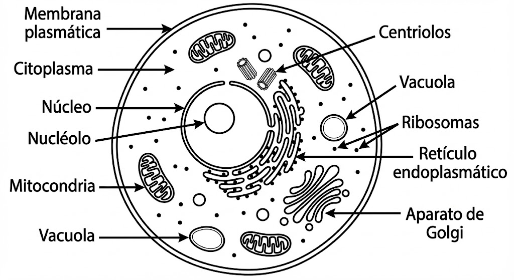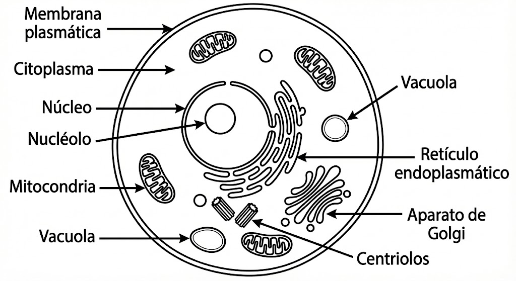 Haz la imagen de la célula animal indicando todas sus estructuras. Nivel 1º de ESO. Apta para ser imprimida en una hoja de papel.