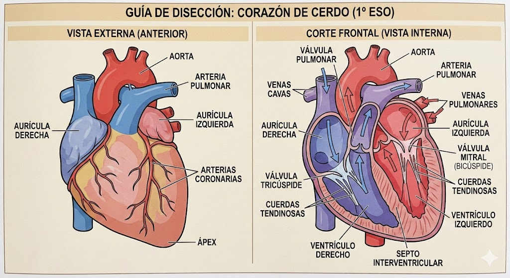 Deseo hacer una disección de corazón de cerdo con los alumnos de 1º de ESO. Haz una imagen para usar en la práctica de forma que sirva de guía al alumnado para entender lo que ven. Estilo: esquema de libro, coloreado