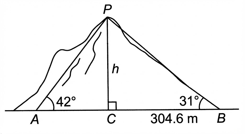 Haz el dibujo del siguiente problema sin resolverlo: Un ángulo de elevación de la cima de una montaña desde un punto sobre la tierra es de 42°. Desplazándose a 304.6 metros más del punto anterior, el ángulo de elevación es de 31°. Calcular la altura de la montaña.