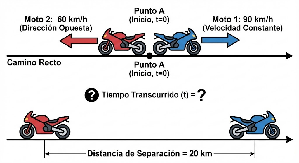 Haz una imagen que represente gráficamente el siguiente problema: Dos motocicletas se encuentran al mismo tiempo en un punto A de un camino recto. El primero se mueve a velocidad constante de 90 km/h y el segundo se mueve en dirección opuesta a 60 km/h. ¿Cuánto tiempo habrá transcurrido hasta que ambos se encuentren separados 20 kilómetros entre sí?