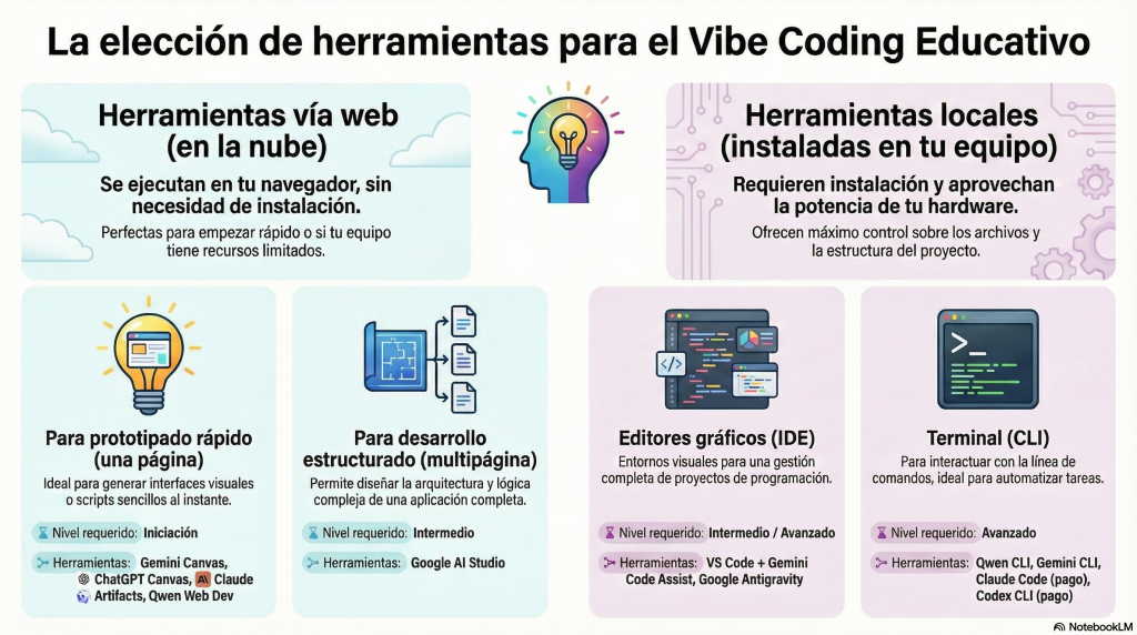 En este contexto, la elección de herramientas adquiere un papel relevante. Conviene aclarar que la selección presentada en esta infografía y en este artículo es una selección personal, centrada de forma intencionada en los grandes chatbots generalistas y sus entornos de trabajo asociados, por ser actualmente los más conocidos y accesibles para el profesorado. Además, esta práctica se apoya cada vez más en comunidades docentes donde se comparten ejemplos reales, dudas y soluciones. Un punto de referencia destacado es el grupo de Telegram Vibe Coding Educativo (https://t.me/vceduca), que reúne a más de 1500 docentes interesados en aplicar este enfoque en el aula. No todas las soluciones sirven para lo mismo, ni todas encajan con el nivel técnico, el tiempo disponible o la infraestructura del centro educativo. La infografía distingue dos grandes categorías: herramientas vía web y herramientas locales, cada una con subtipos claramente diferenciados.