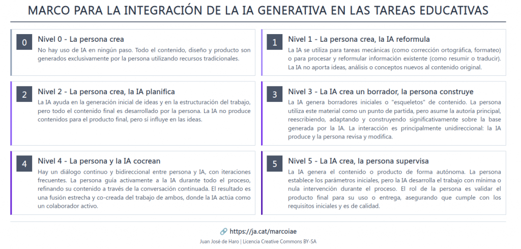 - Permite situar al alumnado y al profesorado en un marco comprensible, clarificando la relación que mantienen con la IA. Esto facilita una mayor transparencia y entendimiento sobre el uso de la tecnología en el entorno educativo.